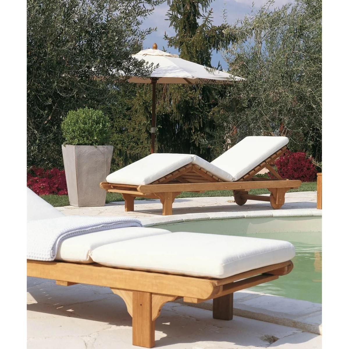 Chelsea bietet eine breite Palette an Outdoor-Möbeln: Tische, Stühle, Sofas und Sonnenliegen aus massivem Teakholz. Die weichen Acrylkissen in Latte (Milchweiss) sorgen für Komfort und eine persönliche Note.