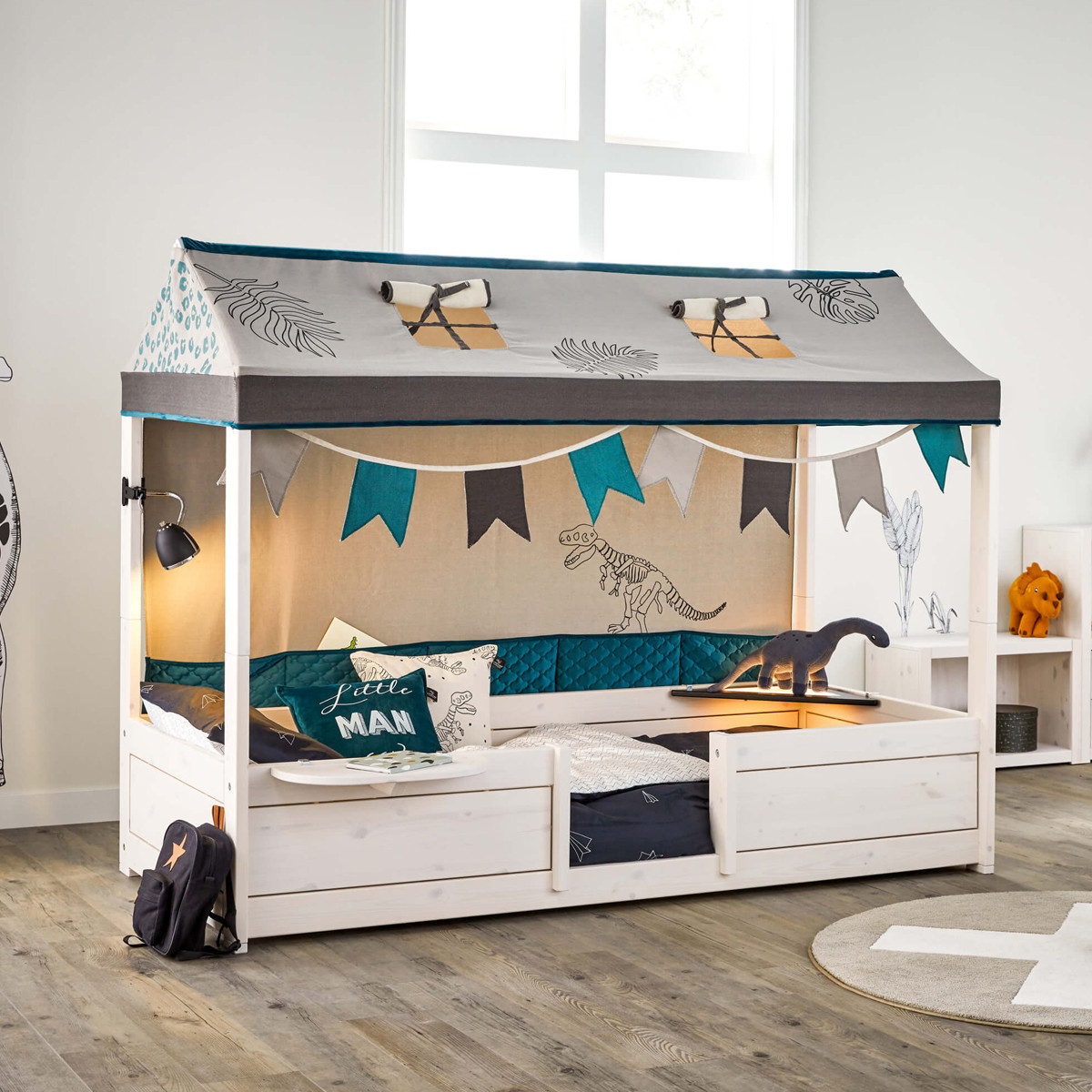 Lit 4-en-1 avec toit en tissu « Dino », 90x200 cm, incluant un sommier à lattes roulant en finition Whitewash