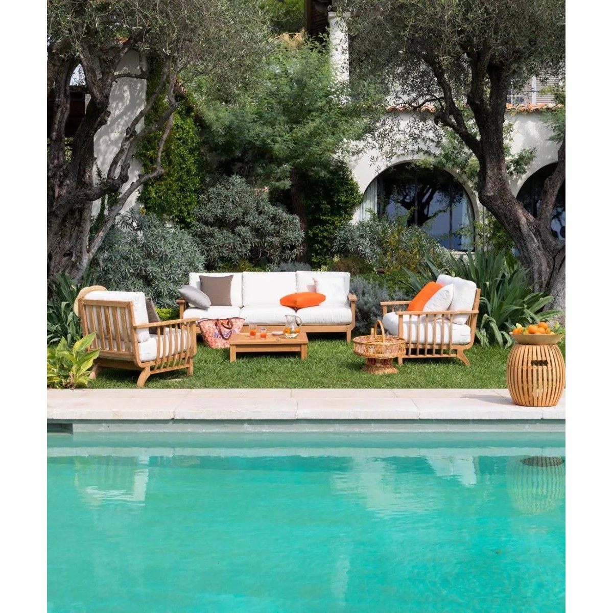 Chelsea offre un'ampia gamma di mobili per esterni: tavoli, sedie, divani e lettini in massello di teak. I morbidi cuscini in acrilico, color bianco latte, garantiscono comfort e un tocco personale.