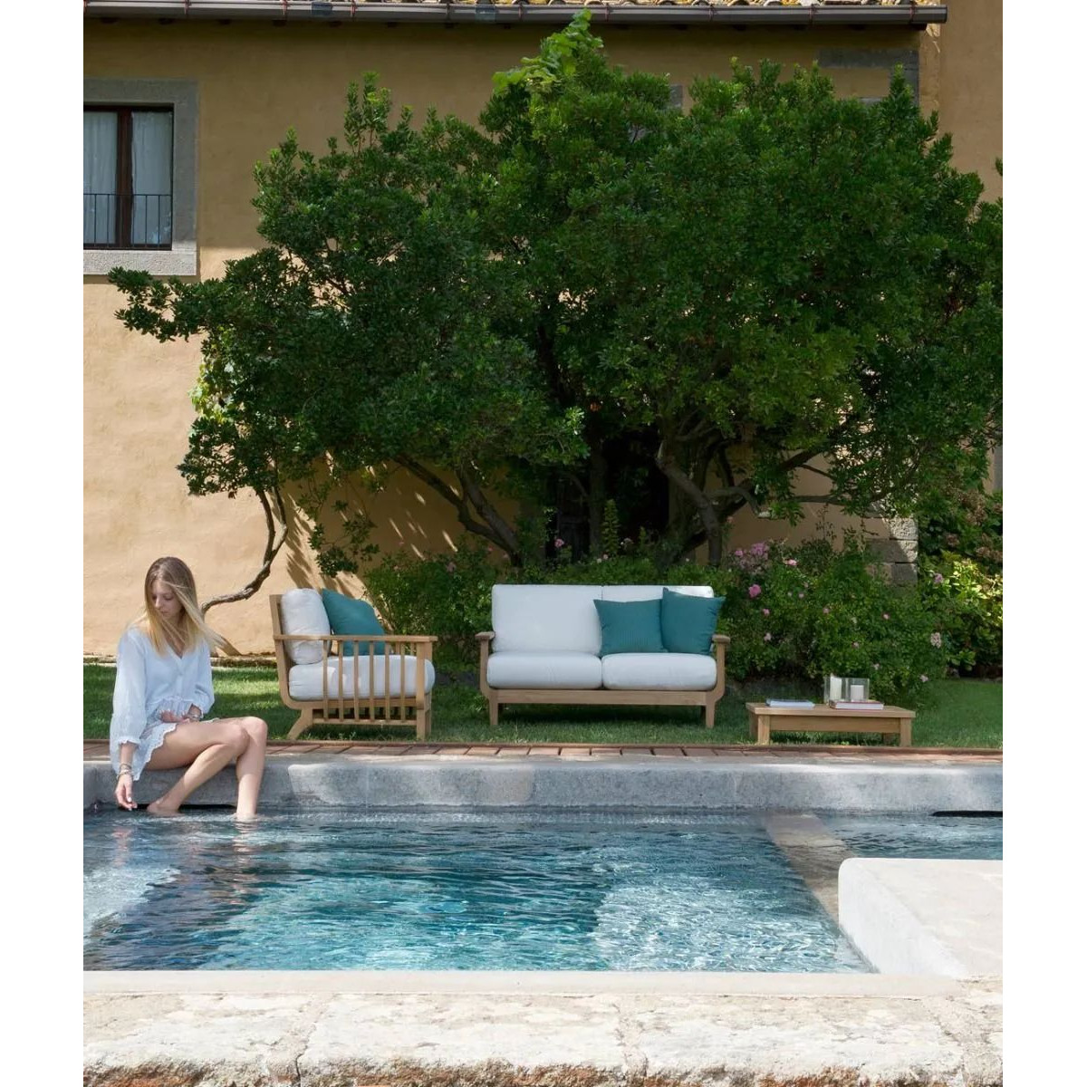 Chelsea offre un'ampia gamma di mobili da esterno: tavoli, sedie, divani e lettini prendisole in legno di teak massiccio. I morbidi cuscini in acrilico color latte garantiscono comfort e un tocco personale.