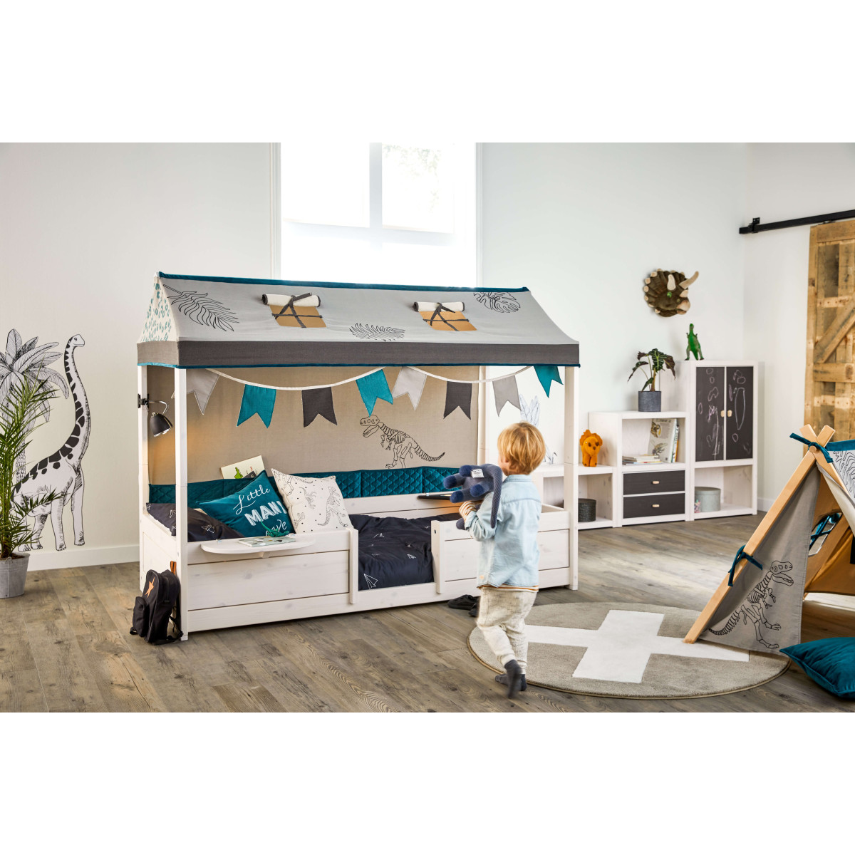 Letto 4-in-1 con tetto in tessuto "Dino", 90x200 cm, incluso rete a doghe estraibile in finitura Whitewash